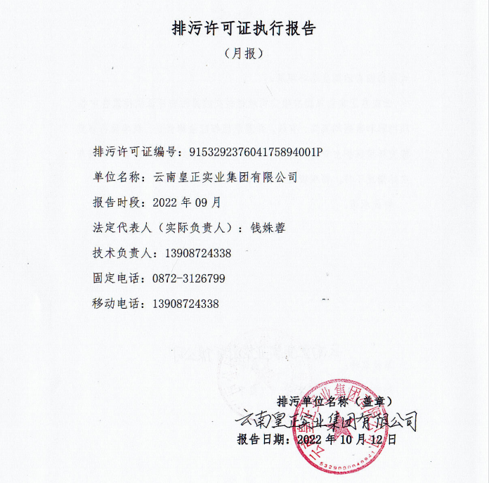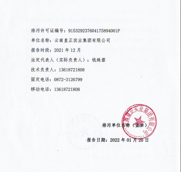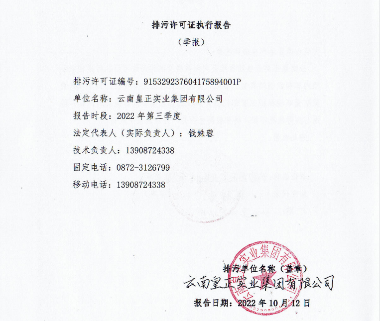 2022年云南皇正實(shí)業(yè)集團(tuán)有限公... 2022年云南皇正實(shí)業(yè)集團(tuán)有限公司排污許可證季報(bào)-第四季度