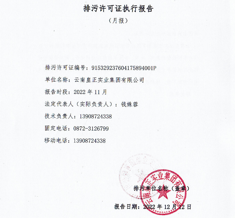 2023-01-18 2022年云南皇正實(shí)業(yè)集團(tuán)有限公司排污許可證季報(bào)-第四季度 查看更多>>