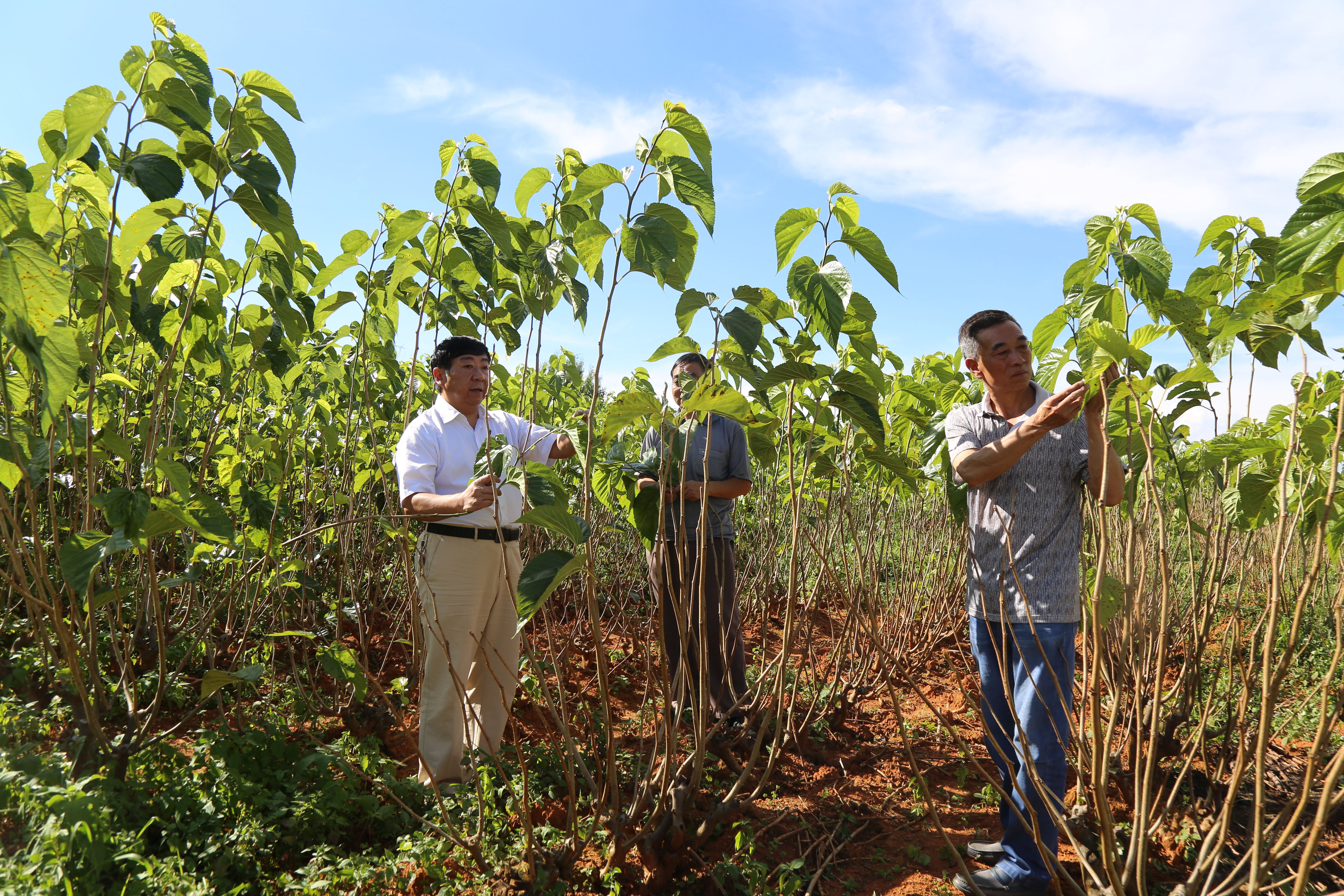 隨后,在村委會(huì)工作人員的帶領(lǐng)下深入桑園進(jìn)行實(shí)地調(diào)研。了解目前桑葉種植基地的規(guī)模、管理模式、桑葉長(zhǎng)勢(shì)、有無(wú)病蟲(chóng)害等情況。
